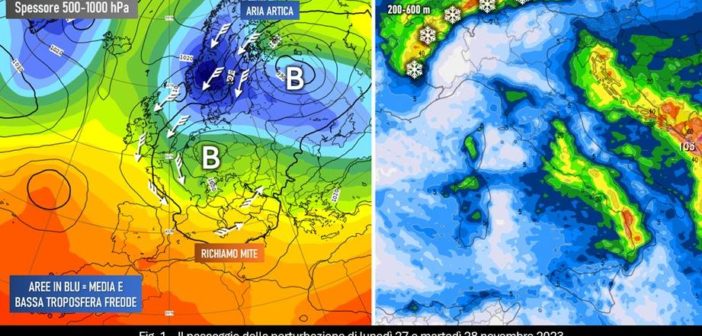 Bisognerà poi aspettare la seconda parte della settimana, grosso modo tra giovedì 30 novembre e venerdì 1° dicembre, per avere probabilmente una replica di questa evoluzione (fig. 2, a sinistra). La vasta circolazione ciclonica europea, ruotando su sé stessa, andrà a stimolare l’ingresso da nord-ovest di un nuovo impulso con l’ausilio di una pulsazione meridiana dell’Anticiclone delle Azzorre. Si verranno così a creare le condizioni per un nuovo passaggio perturbato e quindi un nuovo avvicendamento tra correnti miti e fredde, queste ultime destinate a interessare probabilmente tutta la penisola nei giorni a seguire.