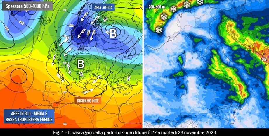 Un primo sistema perturbato ci interesserà proprio all’inizio della settimana (fig. 1, a sinistra): la depressione proverrà dal sud della Groenlandia ed entrando sul continente andrà a unirsi al vortice artico per disegnare una vasta circolazione ciclonica estesa fino alle coste occidentali europee. In riferimento all’Italia, tra il pomeriggio-sera di domani e martedì il sistema perturbato associato porterà le precipitazioni più organizzate al Centro-Sud e in modo particolare sul versante tirrenico perché sarà maggiormente esposto al richiamo mite e umido (fig. 1, a destra): il flusso di aria più temperata determinerà altresì una sensibile risalita della quota dello zero termico e, di pari passo, delle nevicate. Neve che, invece, cadrà fino a quote basso-collinari sui versanti esteri delle Alpi, cioè dove la circolazione ciclonica in transito andrà ad spingere una massa d’aria che resterà nel complesso fredda.