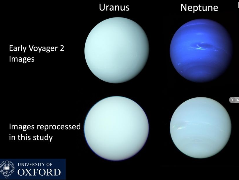 Gli astronomi sanno da tempo che la maggior parte delle immagini moderne dei due pianeti non riflettono accuratamente i loro veri colori e spiegano che «L’equivoco è nato perché le foto scattate ad entrambi i pianeti durante il XX secolo – inclusa la missione Voyager 2 della NASA, l’unico veicolo spaziale a sorvolare questi mondi – hanno registrato immagini in colori separati. Le immagini monocromatiche furono successivamente ricombinate per creare immagini a colori compositi, che non sempre erano accuratamente bilanciate per ottenere un’immagine a colori “veri” e – in particolare nel caso di Nettuno – erano spesso rese “troppo blu”. Inoltre, le prime immagini di Nettuno ottenute dalla Voyager 2 sono state fortemente migliorate dal contrasto per rivelare meglio le nuvole, le bande e i venti che hanno modellato a nostra prospettiva moderna di Nettuno».