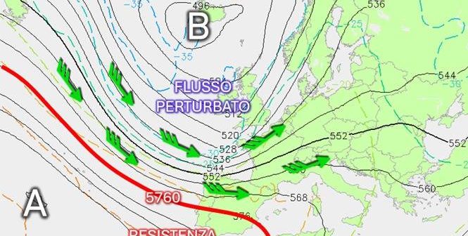 La forma del cavo d’onda, in approccio alle coste occidentali europee proprio nel pomeriggio di giovedì, ci offre uno spunto didattico per comprendere che cosa vuol dire quando i sistemi perturbati trovano anche una minima resistenza anticiclonica lungo il proprio cammino, prima di entrare sul Mediterraneo. Proprio a causa di questo ostacolo, nella prima fase di questo cambio di circolazione l’abbassamento di latitudine dell’intenso flusso perturbato atlantico non farà in tempo a spianare in modo deciso la strada all’ingresso della parte più attiva della perturbazione sulla penisola iberica.
