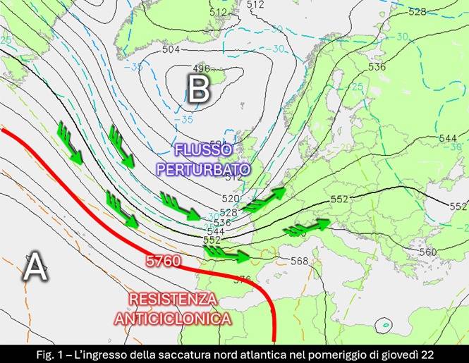La lunga fase stabile ed eccessivamente mite è ormai agli sgoccioli. Già nella giornata di mercoledì 21 i primi avamposti del cambiamento della circolazione hanno avuto modo di lasciar intendere, con la formazione di prevalenti fenomeni di instabilità, che in quota il campo di pressione ha iniziato a indebolirsi. Questa tendenza all’indebolimento si concretizzerà ancor di più tra giovedì 22 e venerdì 23, quando un’ampia e profonda saccatura nord atlantica accompagnerà l’ingresso sul Mediterraneo centro-occidentale di una perturbazione e aprirà, per le nostre latitudini, un periodo piuttosto vivace ed irrequieto che ci accompagnerà in questi ultimi giorni dell’inverno meteorologico (fig. 1).