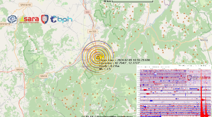 Due scosse di terremoto di Ml 3.5 e Ml 3.1 sono state registrate alle ore 11:55:29 e alle ore 11:57:26, nello spazio di tre minuti nella zona di Spoleto, in Umbria, con ipocentri rispettivamente a 8,2 e 7,8 km di profondità