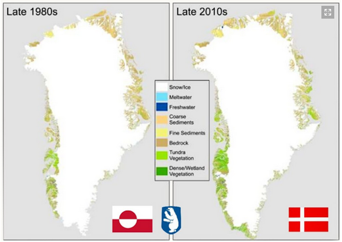 I ricercatori di Leeds, che hanno monitorato i cambiamenti in Groenlandia dagli anni ’80 fino agli anni 2010, spiegano che «Dove una volta c’erano ghiaccio e neve, ora ci sono rocce brulle, zone umide e zone di arbusti. Le temperature dell’aria più calde stanno causando il ritiro del ghiaccio, il che a sua volta sta avendo un impatto sulla temperatura della superficie terrestre, sulle emissioni di gas serra e sulla stabilità del territorio».