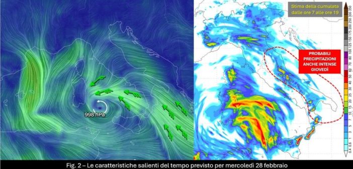 Il riassetto della circolazione ciclonica andrà così a ridistribuire il trasporto del ricarico di aria mite e umida che questa volta sarà diretto soprattutto verso la Sardegna e le regioni centro-meridionali mentre il Nord, lentamente, inizierà a esserne meno coinvolto. Domani, mercoledì 28, sarà quindi la costa orientale dell’isola sarda e le prospicenti aree interne a essere maggiormente interessate dalle precipitazioni più diffuse e organizzate, anche a carattere temporalesco (fig. 2). Il sollevamento forzato a cui andrà incontro l’intenso flusso sciroccale, che sui crinali appenninici dell’appennino calabrese potrebbe causare raffiche con velocità anche superiori ai 100 km/h, determinerà probabilmente sull’area ionica meridionale, grosso modo tra crotonese e messinese, precipitazioni intense con cumulate localmente anche molto abbondanti.