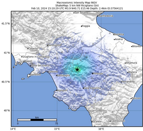 Una scossa di terremoto di magnitudo (Ml) 3.9 è avvenuta alle 16:10:29 ed è stata localizzata nella zona di Ricigliano in provincia di Salerno, in Irpinia, al confine tra Campania e Basilicata, con ipocentro alla profondità di soli 2.4 km.