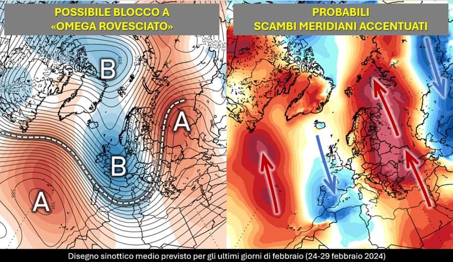 Nell’ultima analisi avevamo appena accennato al fatto che l’ingresso della saccatura nord atlantica – prevista per la seconda parte della prossima settimana – non avrebbe intenzione di evolvere velocemente verso levante e che potrebbe essere alimentata da nuovi impulsi instabili, in arrivo prevalentemente dai quadranti nord-occidentali. Queste due caratteristiche potrebbero allora aprire le porte a un possibile scenario di blocco, detto a «omega rovesciato» perché quella lettera dell’alfabeto greco che tanto utilizziamo per schematizzare i promontori subtropicali è ruotato e quindi, questa volta, indica la sede di una circolazione ciclonica (figura a sinistra).