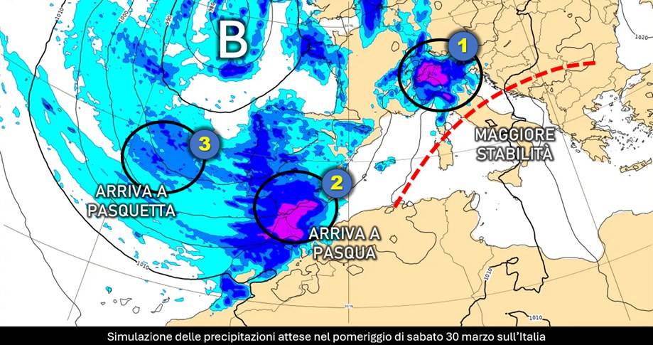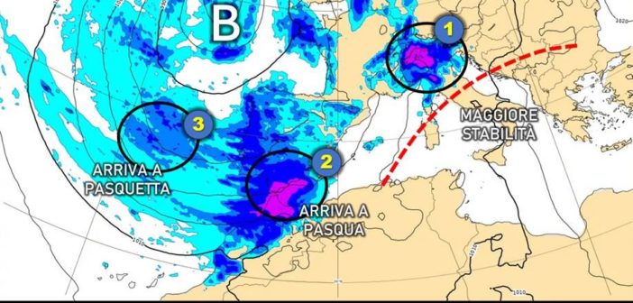 Nel fine settimana pasquale saranno così ben tre gli impulsi instabili che questa circolazione invierà verso la nostra penisola, lungo una traiettoria che correrà attraversando soprattutto le regioni settentrionali e in parte quelle centrali, queste ultime specie nella giornata di lunedì. Se le regioni meridionali e quelle confinanti del Centro si troveranno quindi parzialmente protette da un aumento delle altezze di geopotenziale sufficienti a garantire una maggiore stabilità atmosferica, i restanti settori centrali dell’Italia e soprattutto il Nord vedranno scorrere in successione tre episodi piovosi che conferiranno quindi alle condizioni meteorologiche caratteristiche di estrema dinamicità.