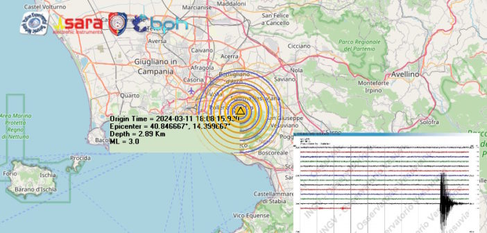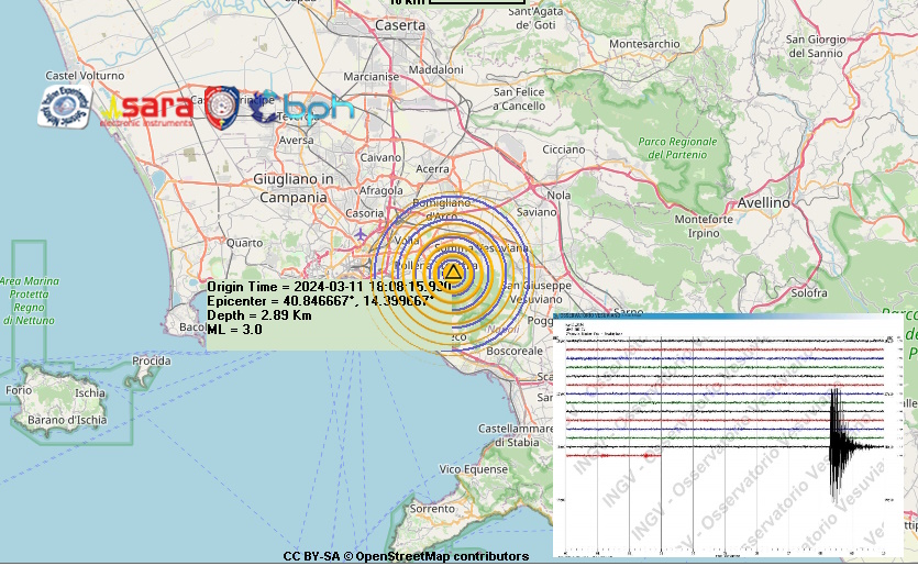 Un terremoto di magnitudo (Md) 3.0 è avvenuto alle ore 19:08:15 ed è stato localizzato nella zona del Vesuvio in Campania, con ipocentro alla profondità di soli 2,9 km.