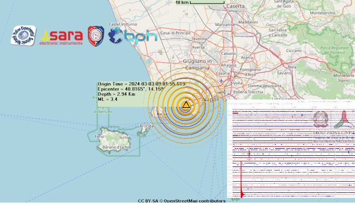 Un terremoto di magnitudo (Md) 3.4 è avvenuto alle ore 10:01:55 ed è stato localizzato nella zona dei Campi Flegrei, nella zona di Pozzuoli (NA) in Campania, con ipocentro alla profondità di 2.9 km. La scossa è stata avvertita in maniera forte, vista la bassa profondità ipocentrale, in molte zone dei campi flegrei e napoletano