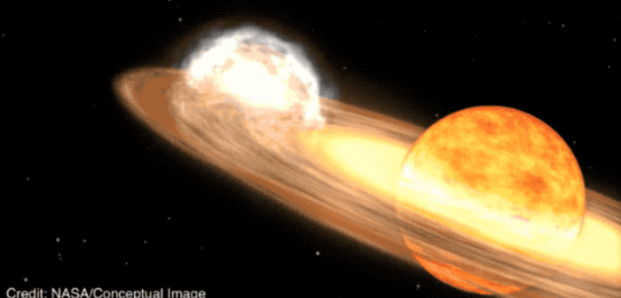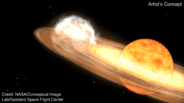 Si tratta, infatti, di un astro molto particolare, chiamato ‘nova ricorrente’: la nana bianca strappa continuamente materia e gas alla sua compagna, una gigante rossa, che si accumula in un disco che ruota intorno alla prima stella; ogni 80 anni circa, il gas raggiunge una temperatura critica che innesca una reazione di fusione nucleare e dà origine alla brillante esplosione.