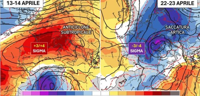 Verso la metà di aprile abbiamo analizzato una situazione meteorologica caratterizzata da una robusta espansione del promontorio subtropicale e abbiamo parlato delle conseguenza che questa circolazione, decisamente calda per il periodo, avrebbe comportato per le temperature. In effetti, abbiamo proprio osservato il campo termico aumentare in modo sensibile, fino a raggiungere in Italia e su buona parte dell’Europa valori decisamente elevati, anche superiori i 30 °C: i molti record di caldo registrati hanno così dato all’evento caratteristiche di eccezionalità (fig. 1, a sinistra).