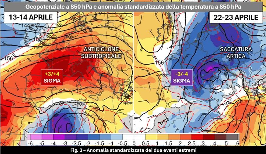 Sono poi bastati appena dieci giorni per sperimentare una situazione meteorologica diametralmente opposta, dovuta a un’impostazione del flusso dai quadranti settentrionali che a più riprese ha inviato impulsi sempre più freddi – prima di matrice polare e poi artica – che hanno cancellato le condizioni preesistenti di caldo marcatamente anomalo per sostituirle con condizioni atmosferiche che hanno portato le temperature su valori insolitamente bassi per l’ultima decade di questo mese, anche di oltre 10 °C in meno rispetto alla norma. In diverse città della Pianura Padana, per esempio, tra il 13-14 aprile e il 22-23 aprile si è passati da massime di 26-30 °C a massime di 7-9 °C, per non parlare dell’ancor più eclatante salto termico che hanno sperimentato i paesi d’oltralpe dove, partendo dalle stesse temperature, sono arrivati a registrare valori minimi di 0/-3 °C: in diversi casi, siamo così passati dai record di caldo a quelli di freddo e quindi a una condizione sempre eccezionale, ma di segno opposto (fig. 1, a destra).