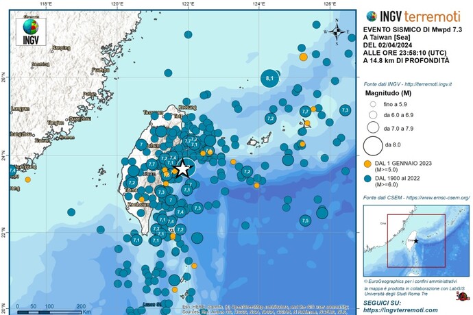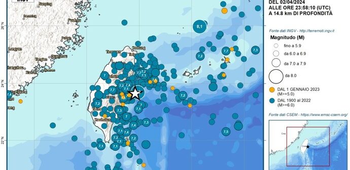 “Di eventi come questi ne avvengono circa una quindicina all’anno nel mondo, dunque si tratta di un fenomeno naturale”, spiega ancora il presidente dell’Ingv. “L’area di Taiwan è già stata interessata in passato da molti grandi terremoti, anche di magnitudo superiore a 8, come quello verificatosi nel 1920”. Quell’evento raggiunse magnitudo 8.2 e si verificò pochi chilometri a Est rispetto a quello avvenuto oggi.