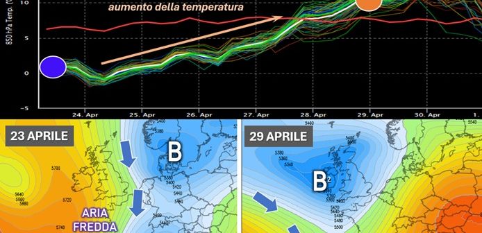 Terminato l’afflusso di aria fredda, ci vorrà ora qualche giorno per ritornare a temperature più vicine a quelle tipiche del periodo. L’andamento delle previsioni di ensemble del campo termico previsto sulla verticale del Centro Italia a circa 1500 metri, prese come esempio solo per dare una valutazione sommaria dei futuri movimenti delle masse d’aria in libera atmosfera, ci mostra infatti una graduale ripresa dei valori di temperatura che in circa 4-5 giorni dovrebbero rientrare nella climatologia di fine aprile. Il graduale afflusso di aria sempre meno fredda, che prenderà piede soprattutto da giovedì, sarà legato a un cambiamento degli equilibri delle figure di alta e di bassa pressione in pieno Oceano: entrerà infatti sulla scena euro-atlantica una circolazione depressionaria, proveniente dal lontano Canada, che andrà a inserirsi nella circolazione artica per rimodularne la forma spostando l’asse della saccatura sul settore occidentale del nostro continente entro i primi giorni della prossima settimana.
