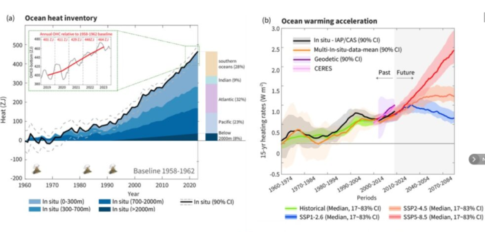 Gli autori – Lijing Cheng e Yuying Pan (Accademia cinese delle scienze), Karina von Schuckmann e Audrey Minière (Mercator Ocean International, Maria Hakuba (Jet Propulsion Laboratory, California Institute of Technology), Sarah Purkey (Scripps institution of oceanography), Gavin Schmidt (NASA) – hanno rivelato che «Nel 2023 l’OHC ha raggiunto un livello record, continuando l’aumento a lungo termine registrato a partire dal 1960z.