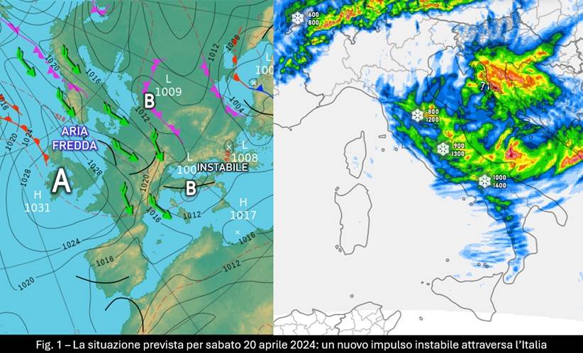 Il primo, ormai prossimo a valicare le Alpi, sarà responsabile nella giornata di domani (sabato 20) di diffuse condizioni di instabilità sulle regioni centrali e del Sud peninsulare secondo uno schema che abbiamo già visto nelle ultime 36-48 ore (fig. 1, a sinistra). Dall’Emilia Romagna verso sud l’irrequietezza dell’atmosfera si manifesterà con la formazione di rovesci e temporali che si presenteranno anche a più riprese nel corso del giorno e che saranno associati a locali grandinate. Nevicate in Appennino a quote per lo più comprese tra 800 e 1300 metri (fig. 1, a destra). Il secondo impulso sarà invece legato alla discesa di una stretta saccatura che, con temperature tra -30 e -32 °C a circa 5400 metri di quota, approfitterà di un parziale rigonfiamento del promontorio azzorriano verso la penisola scandinava per ricevere da questa evoluzione la spinta a percorrere una traiettoria più occidentale e tentare così, tra domenica e lunedì, l’ingresso sul Mediterraneo passando dalla Valle del Rodano (fig. 2, a sinistra).