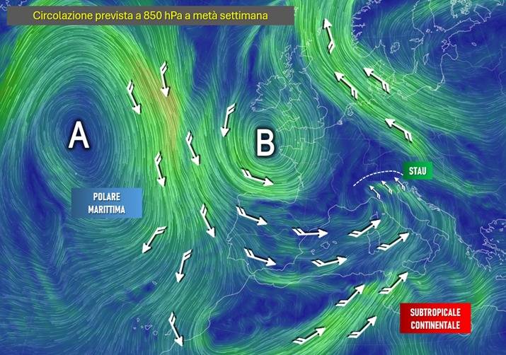 Il gioco delle correnti atmosferiche è semplicemente uno… spettacolo. Osservare infatti come i centri di alta e di bassa pressione lavorano insieme per spostare le masse d’aria che poi vanno a plasmare il nostro tempo, magari con lo zampino di una catena montuosa che si mette di mezzo per esaltare la fenomenologia, si porta sempre dietro quel pizzico di stupore nel momento in cui si osservano in azione i complessi ingranaggi di questa fabbrica meravigliosa che si trova sopra di noi. Per esempio, nel corso della settimana entrante la circolazione atmosferica che andrà impostandosi sul settore centro-occidentale europeo sulla quota isobarica di 850 hPa (circa 1500 metri) dipenderà, come abbiamo già detto nella precedente analisi, dalla posizione di una saccatura nord atlantica.