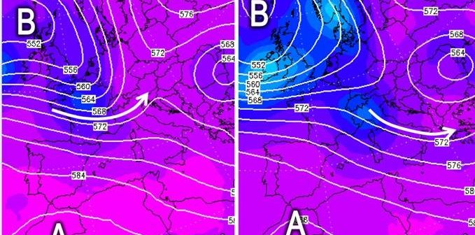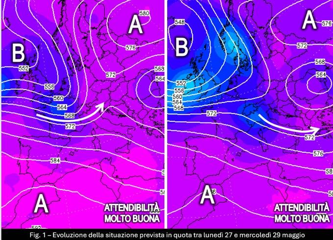 Ecco che allora un primo impulso scivolerà lungo la penisola tra lunedì 27 e mercoledì 29 (fig. 1) e un secondo, probabilmente più strutturato perché potrebbe avere proprio la forma di una saccatura, si affaccerà giovedì 30 per accompagnare la primavera meteorologica alla porta e accogliere la nuova stagione, al debutto il 1° giugno sempre dal punto di vista meteorologico (fig. 2).