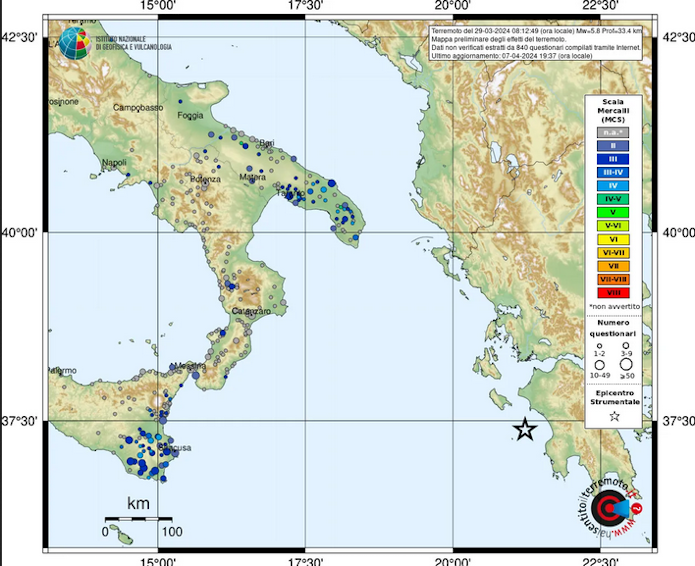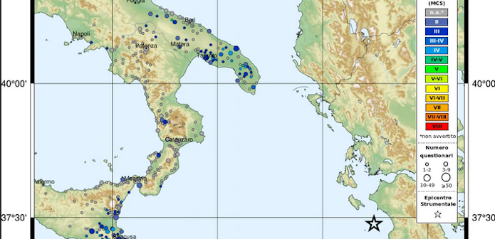 Dalla mappa dei risentimenti macrosismici compilata da oltre 800 cittadini, disponibile sul sito “Hai sentito il terremoto?“, si evince come questo evento sia stato chiaramente percepito nelle aree del sud Italia, in particolare nelle regioni della Puglia, Calabria e Sicilia orientale, con risentimenti stimati fino al IV-V grado della scala macrosismica Mercalli-Cancani-Sieberg (MCS).