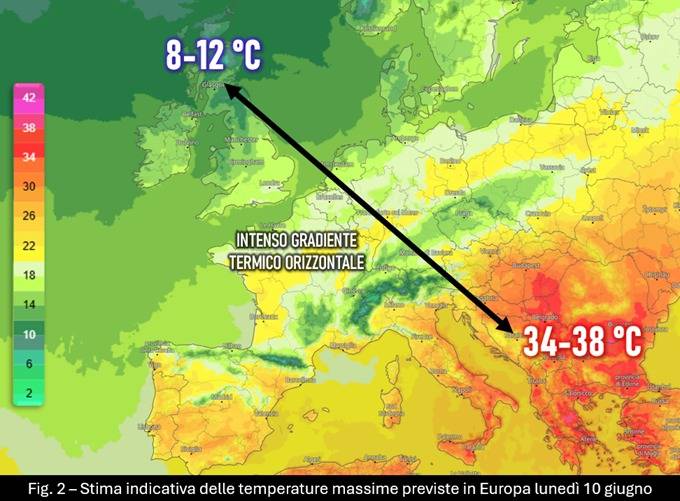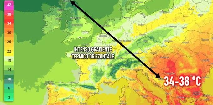 È l’assenza dell’ala protettrice di questo campo anticiclonico a costruire situazioni come quella che andrà delineandosi nei prossimi giorni – sui motivi ne abbiamo già ampiamente discusso in tanti altri articoli – con l’estremo nord-ovest europeo che vedrà temperature massime intorno ai 10 °C a l’area balcanica dove si potrebbero superare i 35 °C (fig. 2). Venticinque gradi, spalmati in duemila chilometri, saranno all’incirca la differenza tra i due poli termici (gradiente termico) che andranno inevitabilmente ad alimentare la formazione di fenomeni atmosferici anche di forte intensità.