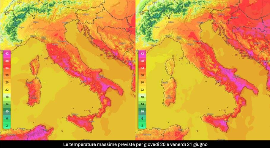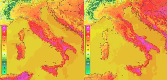 Giovedì 20 – Si raggiungerà e si supererà diffusamente la soglia dei 34-35 °C soprattutto sulle aree interne di Toscana, Umbria, Lazio, Campania, Basilicata, Puglia, Calabria e Isole Maggiori: su queste regioni si potranno anche registrare fino a 37-39 °C con qualche picco di 40-41 °C.