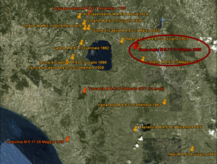 Qua sotto un esempio di ciò che è probabilmente accaduto nel lago durante il terremoto di Bagnoregio e, più in basso, una cartina con tutti i terremoti avvenuti nel viterbese negli ultimi 500 anni (notare il più potente, quello di Bagnoregio, che poi causò queste onde anomale nel lago di Bolsena probabilmente provocate, appunto, da una grossa frana avvenuta nel lago, molto simile a ciò che avvenne nella Valle del Vajont nel 1963). Tuttavia i terremoti nella Tuscia sono generalmente rari e, quando avvengono, il più delle volte si attestano tra i 2 e i 3 di magnitudo, quindi con un’intensità solitamente bassa.