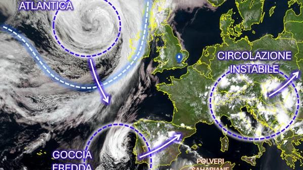 Osservando bene l’immagine, si può anche scorgere l’inizio della risalita di polvere sahariana che ha già oltrepassato le coste algerine e che si muoverà verso nord nel corso dei prossimi giorni, spingendosi fin sulla nostra penisola: l’affondo della goccia fredda verso le basse latitudini sta infatti sollecitando il richiamo di aria calda che trasporterà non solo il particolato desertico, ma determinerà anche una nuova fase decisamente calda specie sulle nostre regioni centro-meridionali che saranno maggiormente esposte agli effetti del promontorio subtropicale, ormai in fase di espansione.