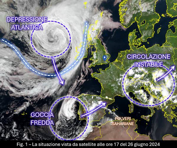 Per conoscere il futuro stato del tempo si parte sempre dal tempo che fa. Ci affidiamo allora alle immagini satellitari di questo pomeriggio per osservare le condizioni atmosferiche attuali e per vedere quali saranno i protagonisti delle condizioni atmosferiche dei prossimi giorni. Lo scatto riferito alle ore 17 (fig. 1) ci mostra la circolazione di aria fresca e instabile che sta ormai abbandonando la nostra penisola e una goccia fredda, in prossimità delle coste portoghesi, destinata a muoversi verso le coste marocchine prima di essere agganciata dal flusso perturbato atlantico che poi, a foggia di saccatura, si muoverà verso le nostre regioni iniziando ad interessarle a partire da quelle di Nord-Ovest nel corso del fine settimana.
