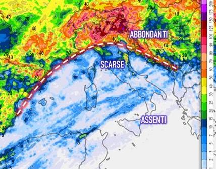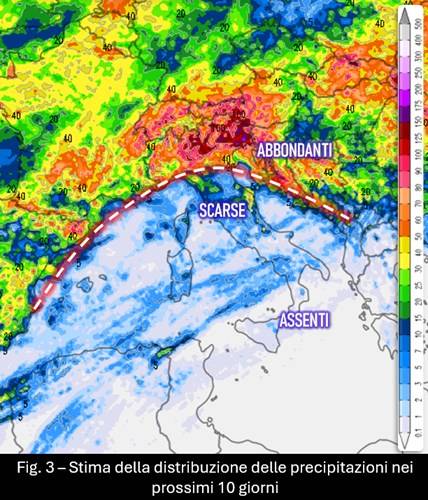 Lo scenario che si va profilando, ora certamente più nitido rispetto a qualche giorno fa, lascia quindi intendere che la dinamica atmosferica sembra essere ancora intenzionata a proseguire sulla strada percorsa nel mese scorso e quindi a rimarcare, ancora una volta, le differenze pluviometriche tra le regioni settentrionali che continueranno ad accumulare pioggia e quelle meridionali che si troveranno sempre più agli antipodi (fig. 4): al Sud, purtroppo, contribuirà a peggiorare lo stato della siccità anche il caldo a tratti intenso che inevitabilmente accelererà il processo di evapotraspirazione. L’avvio di questa nuova situazione meteorologica di blocco ci invita inoltre di allargare gli orizzonti temporali per guardare nel complesso al comportamento del tempo degli ultimi mesi e degli ultimi anni e constatare, ancora una volta, come la ripetitività di questo tipo di condizioni atmosferiche continui a essere una costante delle evoluzioni del nostro tempo.