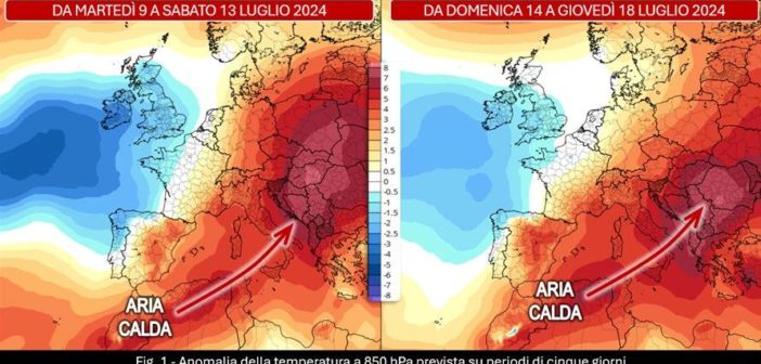 Il segnale caratterizzante del tempo non subirà infatti sostanziali cambiamenti almeno fino alla fine della seconda decade, come è ben intuibile osservando per esempio la previsione dell’anomalia di temperatura a 850 hPa, mediata su intervalli di cinque giorni (fig. 1): tra il 9 e il 13 luglio e poi tra il 14 e il 18 è evidente come rimanga sempre attivo il richiamo di aria calda dall’entroterra sahariano, diretto principalmente verso le nostre regioni centro-meridionali e l’Europa orientale, con la penisola balcanica che sarà esposta ai massimi effetti dell’avvezione perché qui le temperature si porteranno fino a 7-8 °C oltre la media del periodo. Più attenuato lo scarto positivo dal clima sull’Italia e qui compreso, in genere, tra 3 e 6 °C in quota e tra 3 e 8 °C a due metri dal suolo. Data la situazione quasi ingessata, non ci resta allora che andare avanti passo dopo passo proponendo la previsione della temperatura massima, partendo dai prossimi due giorni (fig. 2).