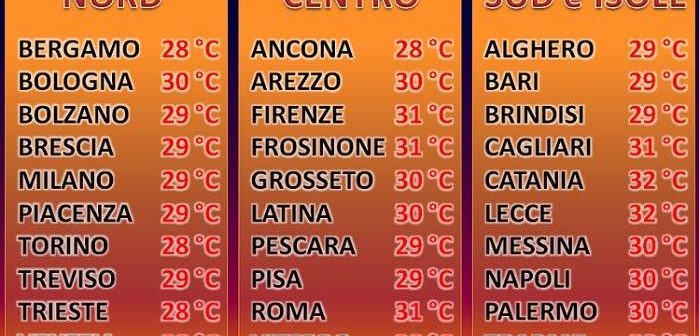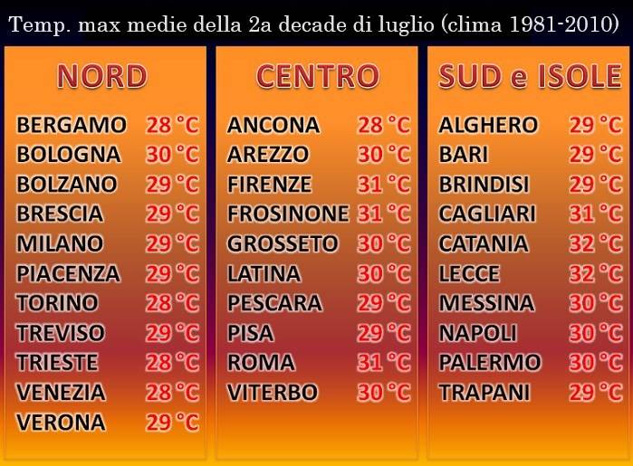 La normalità climatica della seconda decade di luglio per le principali città italiane è indicata in tabella: sono questi i valori di temperatura massima che mi aspetto che vengano registrati a spasso per l’Italia.