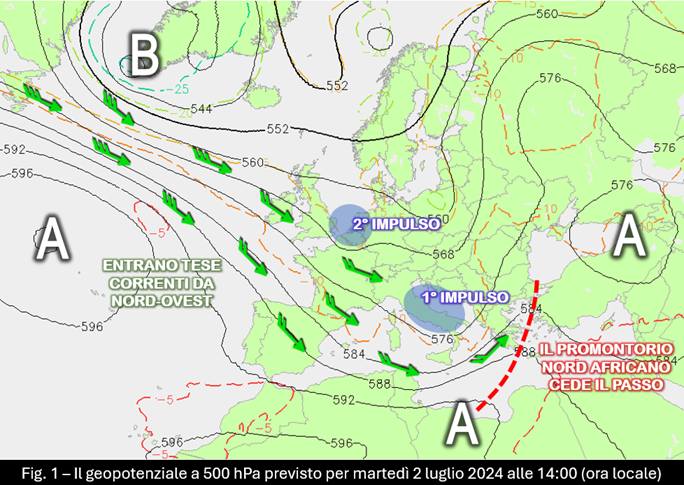 Sul bacino centrale del Mediterraneo è iniziato il cambiamento di circolazione che nelle prossime 36-48 ore vedrà la nostra penisola essere attraversata da due distinti impulsi instabili, guidati dal nastro della corrente a getto polare in fase di temporanea accelerazione sul Nord Atlantico (fig. 1): il primo, entrato nel corso del pomeriggio odierno sulle regioni settentrionali, transiterà domani (martedì 2) e il secondo seguirà a ruota nella giornata di mercoledì 3.