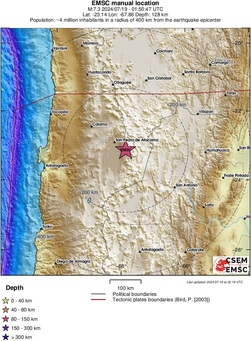 Secondo il Servizio Geologico degli Stati Uniti USGS il terremoto ha avuto epicentro 45 km ESE di San Pedro de Atacama nella regione omonima, con ipocentro a circa 117 km di profondità. Evento avvertito in maniera forte in molte località del Cile anche a grande distanza. Potrebbero esserci danni