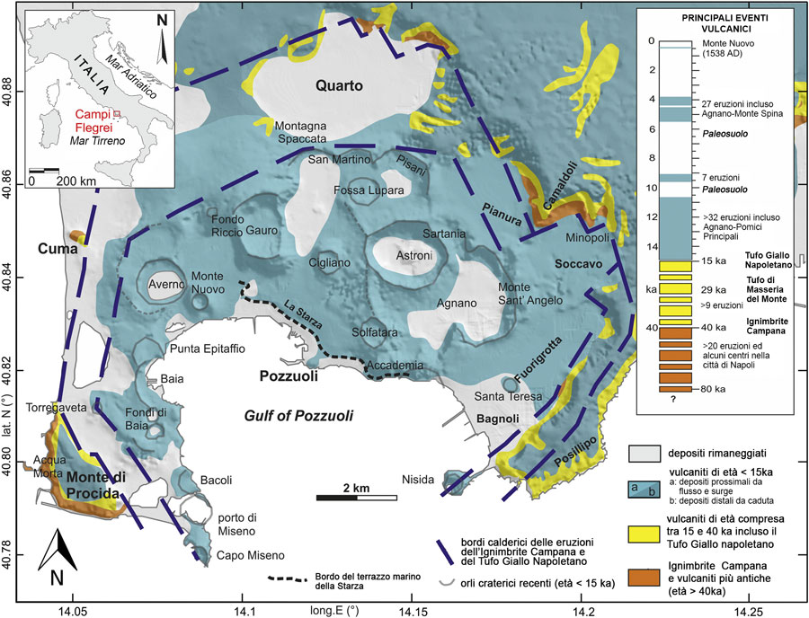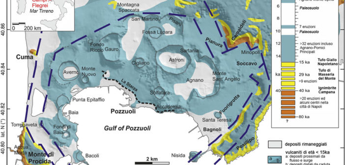 I Campi Flegrei sono un campo vulcanico attivo da più di 80.000 anni la cui storia eruttiva è stata caratterizzata da almeno due eventi di grande magnitudo che hanno generato una caldera ampia circa 200 Km2: l’eruzione dell’Ignimbrite Campana, avvenuta circa 40.000 anni fa e l’eruzione del Tufo Giallo Napoletano, avvenuta 15.000 anni fa. Recenti studi suggeriscono l’esistenza di un terzo evento di elevata energia avvenuto intorno a 29.000 anni fa: l’eruzione del Tufo di Masseria del Monte (Albert et al., 2019).