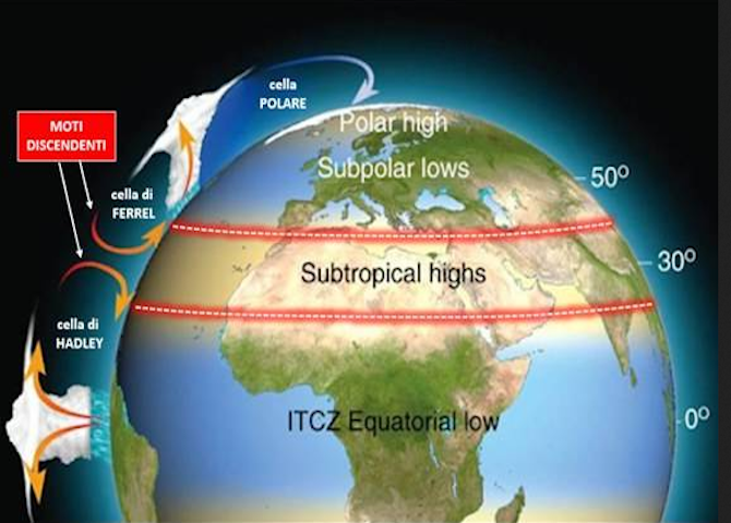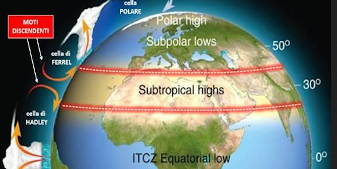 Guardando solo al nostro emisfero, la prima imposta la tra l’equatore e i 30°N, mentre la seconda da questa latitudine fino ai 60° N. Senza entrare troppo nello specifico e tenendo presente che questi schemi appena descritti sono molto semplificati ma comunque sufficienti per comprendere la dinamica che si verifica, diciamo che l’azione congiunta di questi due rami favoriscono, proprio intorno ai 30° di latitudine nord, dei moti discendenti delle masse d’aria che sono proprio tipici delle aree di alta pressione. A questo punto dobbiamo considerare il tipo di suolo su cui arrivano questi moti, impostati dall’alto verso il basso dalla dinamica atmosferica a grande scala. La fascia anticiclonica che sovrasta la terraferma – cioè l’entroterra nord africano – non ha la forza per raggiungere con i propri moti discendenti gli ultimi strati della troposfera perché questi, d’estate, risentono dell’eccessivo riscaldamento del suolo desertico: l’aria molto calda, se non addirittura rovente con temperature anche superiori ai 30 °C a 1500 metri, si espande ed espandendosi fa diminuire la pressione atmosferica nei bassi strati.