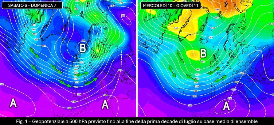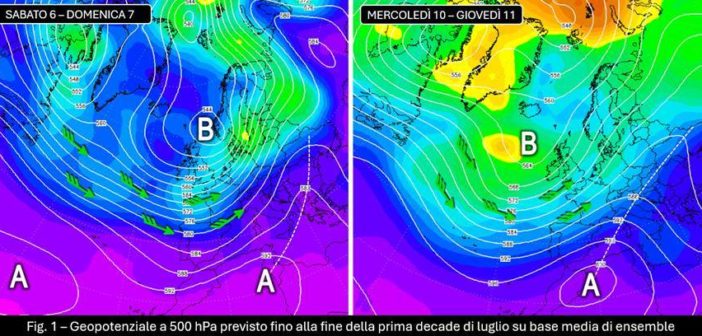 In questa prima decade di luglio sarà proprio questo il segnale che andrà a definire il tempo dell’Italia. Dopo una temporanea disposizione delle correnti in quota dai quadranti occidentali, che scorreranno sulla nostra verticale tra giovedì 4 e venerdì 5 portando un tipo di tempo in prevalenza soleggiato, ecco che nel fine settimana una nuova e ampia curvatura ciclonica delle correnti sul settore occidentale europeo andrà, da un lato, a esporre le regioni settentrionali al probabile transito delle ennesime condizioni di instabilità e, dall’altro, a posizionare il Centro-Sud sul fianco ascendente di una nuova cresta subtropicale (fig. 1, a sinistra). Intorno alla metà della prossima settimana, una retrogressione dell’intero sistema ondulatorio potrebbe invece far entrare tutta la nostra penisola entro il raggio d’azione del promontorio nord africano (fig. 1, a destra), con l’avvezione di aria calda che prenderebbe a questo punto una via più occidentale per raggiungere le latitudini mediterranee.