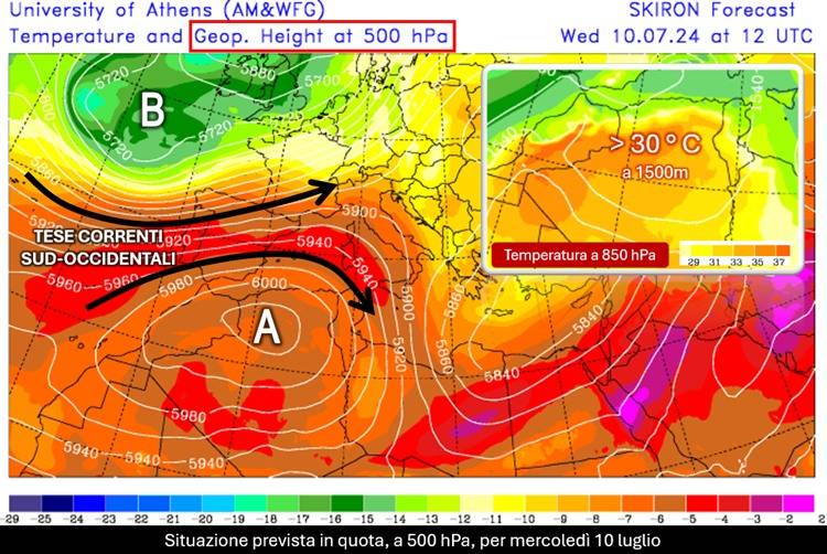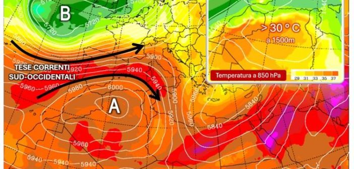 Servirà allora appena un cenno di cavo d’onda in approccio alle coste dell’Europa occidentale per innescare alle quote superiori tese correnti sud-occidentali che risucchieranno parte di quella massa d’aria rovente presente sulla verticale dell’entroterra sahariano indirizzandola verso la nostra penisola. Questa dinamica favorirà così, in particolar modo al Centro-Sud, l’arrivo di isoterme a circa 1500 metri su valori per lo più compresi tra 20 e 25 °C.