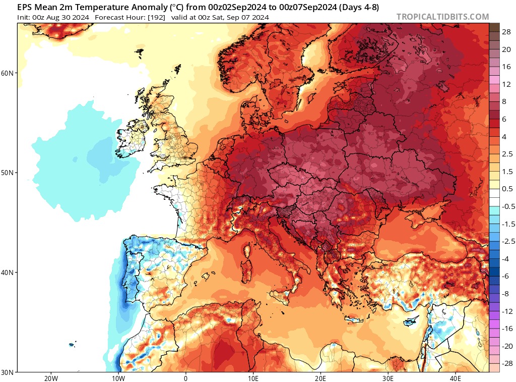 Se si pensa che per la climatologia i valori attesi nella prima decade di settembre oscillano grossomodo tra 26 e 28 °C, è evidente quanto il peso dell’anomalia termica diventi importante perché vorrà dire che, almeno fino a domenica 8 settembre, resteremo in genere tra i 4 e gli 8 °C al di sopra delle medie climatologiche, in compagnia della maggior parte delle regioni europee.