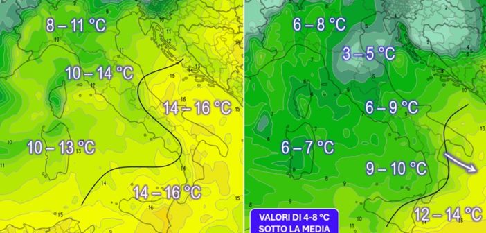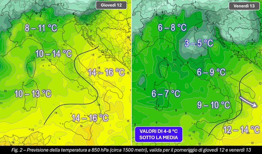 Sarà venerdì la giornata in cui l’aria fredda si propagherà con decisione a tutta la nostra penisola, raggiungendo entro la serata anche le estreme regioni meridionali. Su tutta l’Italia il campo termico a 850 hPa si porterà così su valori per lo più compresi tra 5 e 10 °C (fig. 2, a destra), segnando in tal modo uno scarto negativo rispetto alla climatologia del periodo in genere compreso tra i 4 e gli 8 °C, ma con picchi fino a 8-10 °C in meno sull’arco alpino dove farà insolitamente freddo per il periodo. Per quanto riguarda i fenomeni, già dalla mattina di domani (giovedì 12) prime timide schiarite al Nord-Ovest con venti di föhn. Instabile con rovesci e temporali anche localmente intensi dalla Lombardia orientale al Friuli Venezia Giulia e, più a sud, anche tra Levante Ligure, Toscana settentrionale ed Emilia, in esaurimento serale. Nevicate sulle Alpi centro-orientali a quote via via più basse, fino a raggiungere in genere i 1400-1500 metri. Già dal mattino tempo instabile anche sulle regioni centrali tirreniche e sulla Sardegna con fenomeni ancora sparsi, ma con tendenza a ulteriore peggioramento tra il pomeriggio e la serata, quando le precipitazioni tenderanno a divenire più diffuse e intense, anche carattere temporalesco, dapprima sull’Isola a poi soprattutto tra il Lazio, i rilievi abruzzesi e la Campania: su quest’ultima regione il peggioramento arriverà soprattutto nelle ore serali. Ancora in attesa le restanti regioni meridionali e il versante adriatico centrale, anche se su questo settore i primi fenomeni potrebbero arrivare già entro le prime ore della notte.