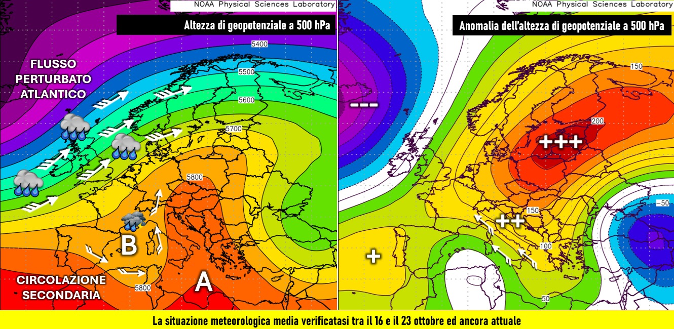Il segnale atmosferico medio del periodo compreso tra il 16 e il 23 ottobre, ancora attuale (immagine a sinistra), mostra in modo chiaro il braccio di ferro tra la figura depressionaria a ovest e quella anticiclonica a est che insieme vanno comunque a dare forma a una struttura atmosferica ancora caratterizzata da altezze di potenziale elevate, prossime ai 5750-5800 metri sulla quota isobarica di 500 hPa proprio sul Mediterraneo centro-occidentale: si tratta di valori ancora tardo estivi e quindi anomali per il periodo non solo alle nostre latitudini, ma soprattutto sul settore europeo centro-orientale dove l’anomalia relativa proprio all’altezza di geopotenziale raggiunge il valore di ben 200 metri (immagine a destra): in pratica, vuol dire che su queste aree c’è ancora molta aria calda che dilata a tal punto l’atmosfera da far registrare la pressione atmosferica di 500 hPa a una quota di circa 200 metri più alta rispetto a quella alla quale dovremmo registrarla a fine ottobre.