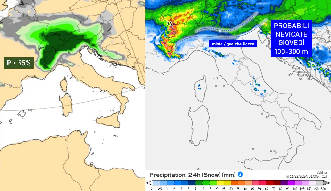Per questa ragione, gli ultimi aggiornamenti della modellistica numerica iniziano a proporre, proprio per giovedì, il passaggio di una fase nevosa il cui segnale diventa ormai altamente probabile per i settori sopra indicati (figura a sinistra). In chiave deterministica le prime indicazioni, che andranno ancora aggiornate con gli ultimi ricalcoli di domani, suggerirebbero nevicate ancora una volta importanti su Alpi piemontesi e Valle d’Aosta e meno abbondanti procedendo verso est. Sul Piemonte, la neve potrebbe arrivare ad imbiancare anche l’alta pianura, orientativamente dal torinese verso nord: uno scenario simile potrebbe verificarsi anche per le pianure dell’alta Lombardia, mentre in Trentino Alto Adige il fenomeno nevoso dovrebbe spingersi fino a fondovalle senza problemi.