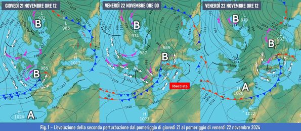 A seguire, la pressione atmosferica subirà un rapida risalita e le condizioni atmosferiche tenderanno rapidamente a ristabilizzarsi entro il fine settimana. Il passaggio della perturbazione inizierà a farsi strada nel corso della mattinata di domani, con le prime nubi e precipitazioni nevose fino a quote collinari sulle Alpi occidentali (fig. 2, a sinistra). Residue piogge o rovesci tra la Calabria e la Sicilia tirrenica, legati al primo sistema frontale. Nel pomeriggio rapido aumento della nuvolosità al Nord, lungo il versante tirrenico centro-settentrionale e sulla Sardegna, con precipitazioni più probabili sul Levante Ligure, sulla Toscana centro-settentrionale e a nord del Po partendo dal Nord-Ovest. Qualche piovasco anche sulla costa occidentale della Sardegna, fino alle aree interne. In serata, estensione dei fenomeni al Nord-Est e a tutta l’area tirrenica costiera e interna fino alla Campania, con possibilità anche di temporali: a causa dell’intensa ventilazione, le cumulate più significative sono previste a ridosso dei rilievi, in particolar modo su quelli tosco-emiliani.