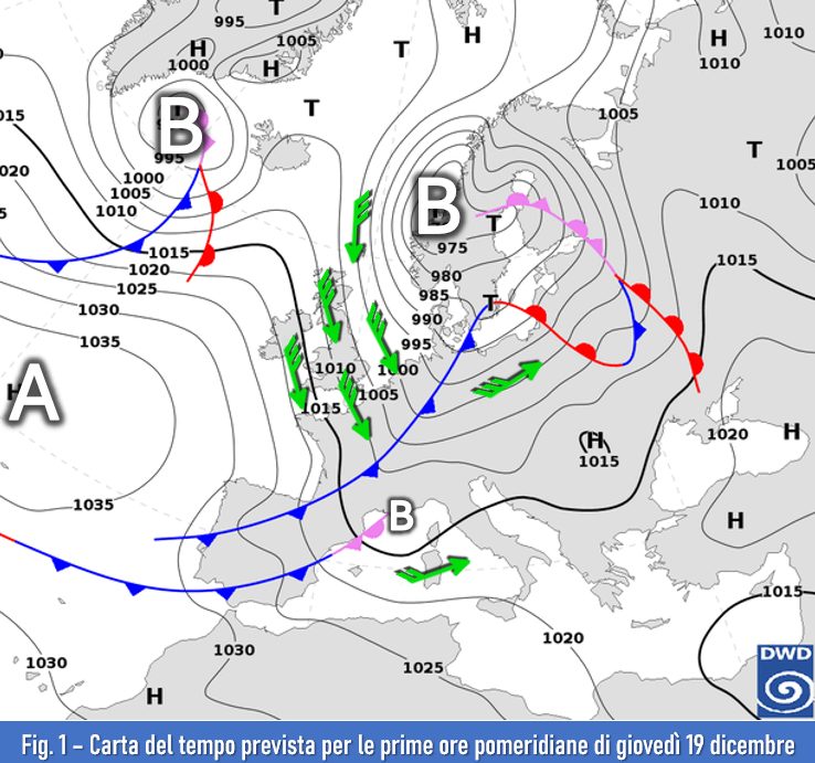 Ci soffermiamo, per il momento, a esaminare il passaggio della prima perturbazione che inizierà a far sentire i propri effetti dal pomeriggio di giovedì 19 dicembre, quando con il proprio fronte freddo si avvicinerà alla nostra catena alpina (fig. 1).