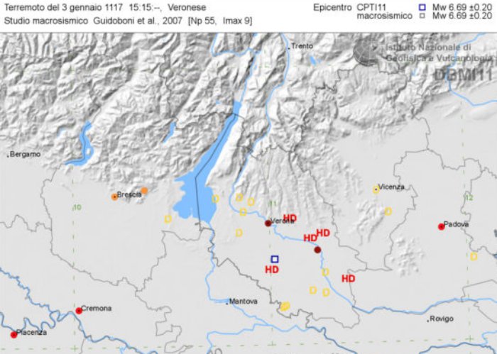 L’evento più forte della sequenza si è quindi verificato nel primo pomeriggio del 3 gennaio 1117 e ha duramente colpito l’area della Pianura Padana veronese, causando danni da Piacenza sino alla costa adriatica. Parte di questi danni sono stati identificati per mezzo di un’estesa ricerca su restauri e ricostruzioni, in edilizia ecclesiastica, successivi al 1117.