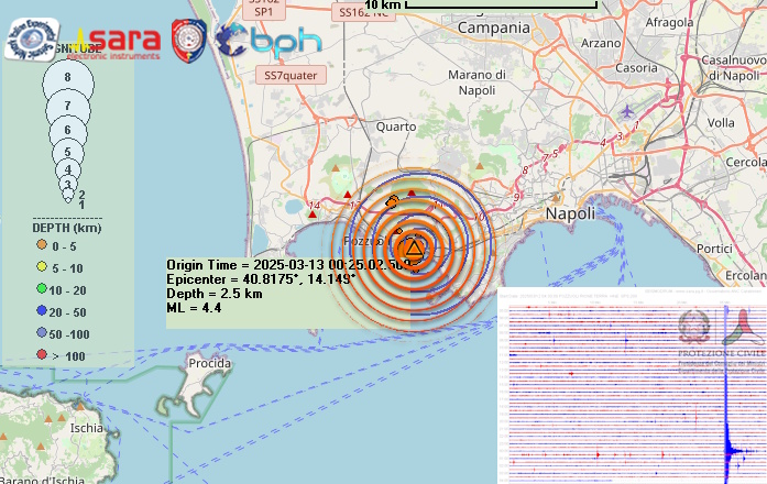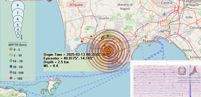 Un terremoto di magnitudo (MD) 4.4 è avvenuto alle ore 01:25:02 ed è stato localizzato nella zona dei Campi Flegrei, nel golfo di Pozzuoli, nel comune omonimo (NA) in Campania, con ipocentro alla profondità di soli 2,5 km.