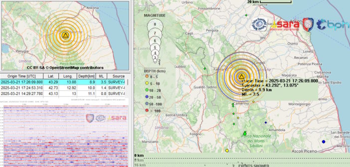 Epicentro nel comune di Gagliole (MC), ipocentro superficiale, a circa 6 km di profondità, evento avvertito dalla popolazione in molte zone delle Marche e in quelle al confine con l’Umbria