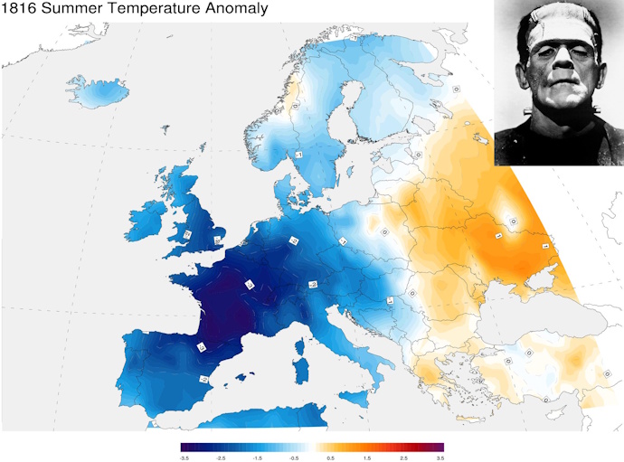 Nella Svizzera che ospita i coniugi Shelley, il tasso di mortalità cresce del 20% fra il 1816 e il 1817. In tutta Europa molti muoiono di fame, mentre cresce la tensione politica e sociale, che spesso sfocia in disordini e sommosse. È in questo clima, non solo meteorologico, che la storia di Frankenstein è stata concepita.