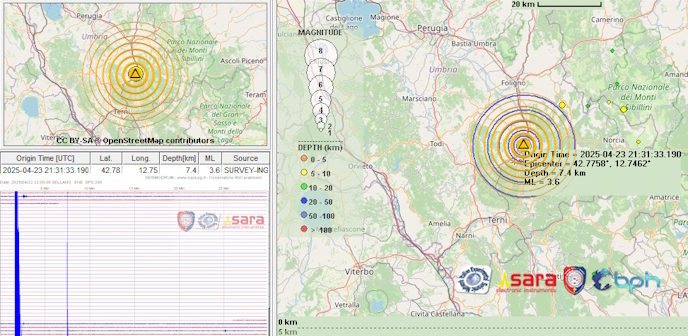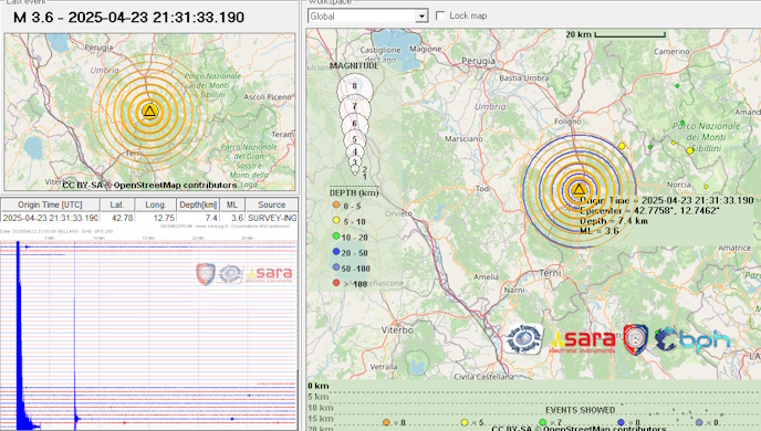 Una scossa di terremoto di magnitudo 3.6 è avvenuta alle ore 23.31.33 italiane nella zona Spoleto (PG)  in Umbria con ipocentro alla profondità di 7,4 km.