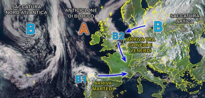 La seconda circolazione di bassa pressione, denominata B2, fa parte invece della saccatura artica che ancora interessa con la propria aria fresca e instabile l’Europa centro-orientale, fino al Mar Nero. Il piccolo minimo depressionario resterà in posizione quasi stazionaria nei pressi delle Isole Britanniche fino a martedì, quando una nuova pulsazione verso le alte latitudini dell’Anticiclone delle Azzorre imprimerà a questa figura la necessaria spinta per iniziare a muoversi verso sud-est: la figura barica si troverà da un lato il cammino spianato dal passaggio della circolazione B1 e dall’altro riceverà nuova linfa dalla saccatura artica. Questo secondo impulso, in arrivo tra giovedì 22 e venerdì 23 maggio, riuscirà a condizionare il tempo di tutta la penisola.