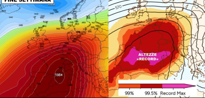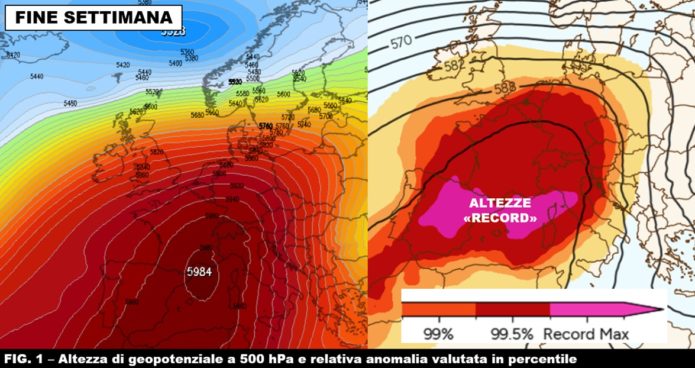 In media e alta troposfera, oltre i 5000 metri di quota, il Mediterraneo centro-occidentale e gli analoghi settori europei saranno interessati dall’ennesima pulsazione del promontorio nord africano come conseguenza di una rimodulazione dell’ampio cavo d’onda presente al largo dell’Oceano Atlantico. Il rigonfiamento della campana anticiclonica subtropicale, determinato dal massiccio apporto di aria calda, sarà tale da spingere le altezze di geopotenziale a quote molto elevate, fino a superare i 5960 metri sul Nord Ovest, la Toscana e la Sardegna e a raggiungere un picco di circa 5984 metri in prossimità del Golfo del Leone per quanto riguarda la posizione della superficie isobarica di 500 hPa (fig. 1, a sinistra).